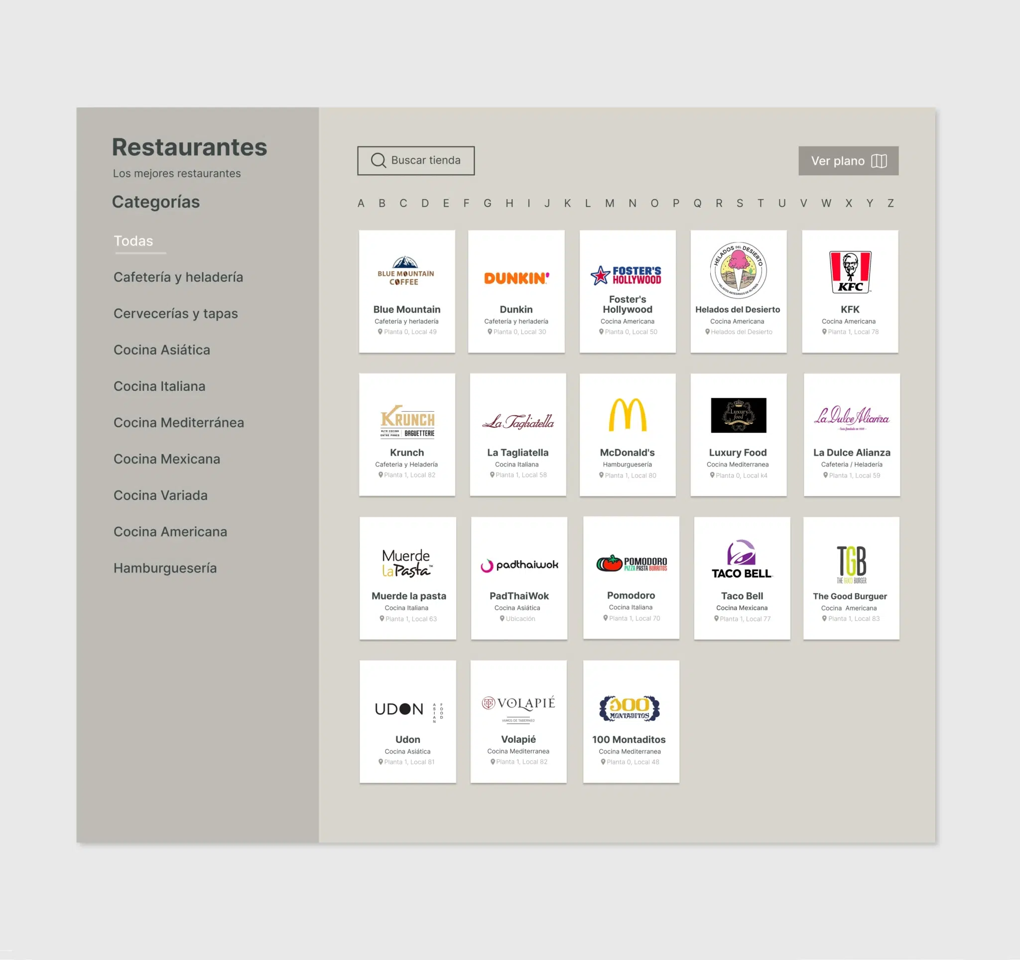 Un directorio A–Z con buscador y filtro por categoría resuelve rápido. Cards consistentes y el botón “Ver plano” que abre el hotspot del área ayudan a ubicar la tienda/restaurant sin perder el contexto.