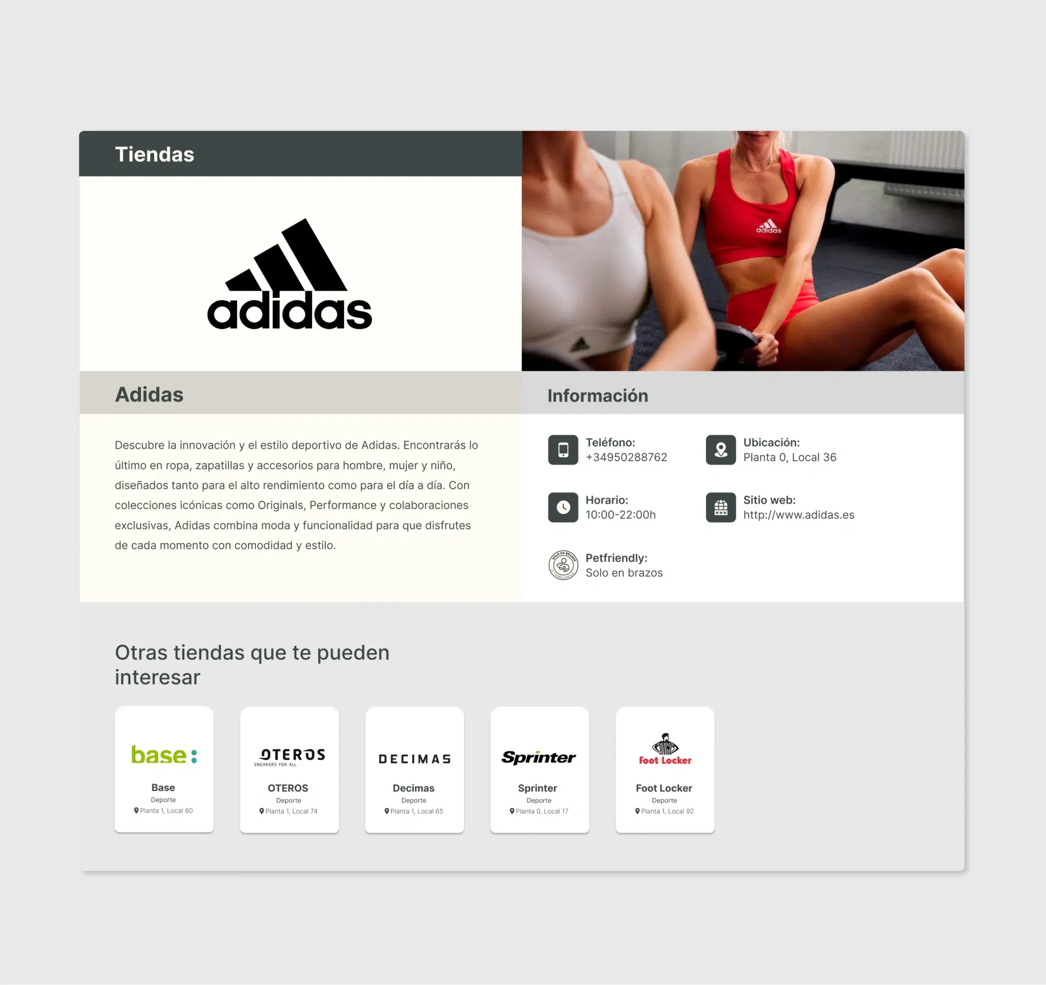 Fichas uniformes y escaneables: la información esencial, hero visual cuidado, y un bloque de “Otras tiendas que te pueden interesar” para continuar la navegación sin volver atrás.